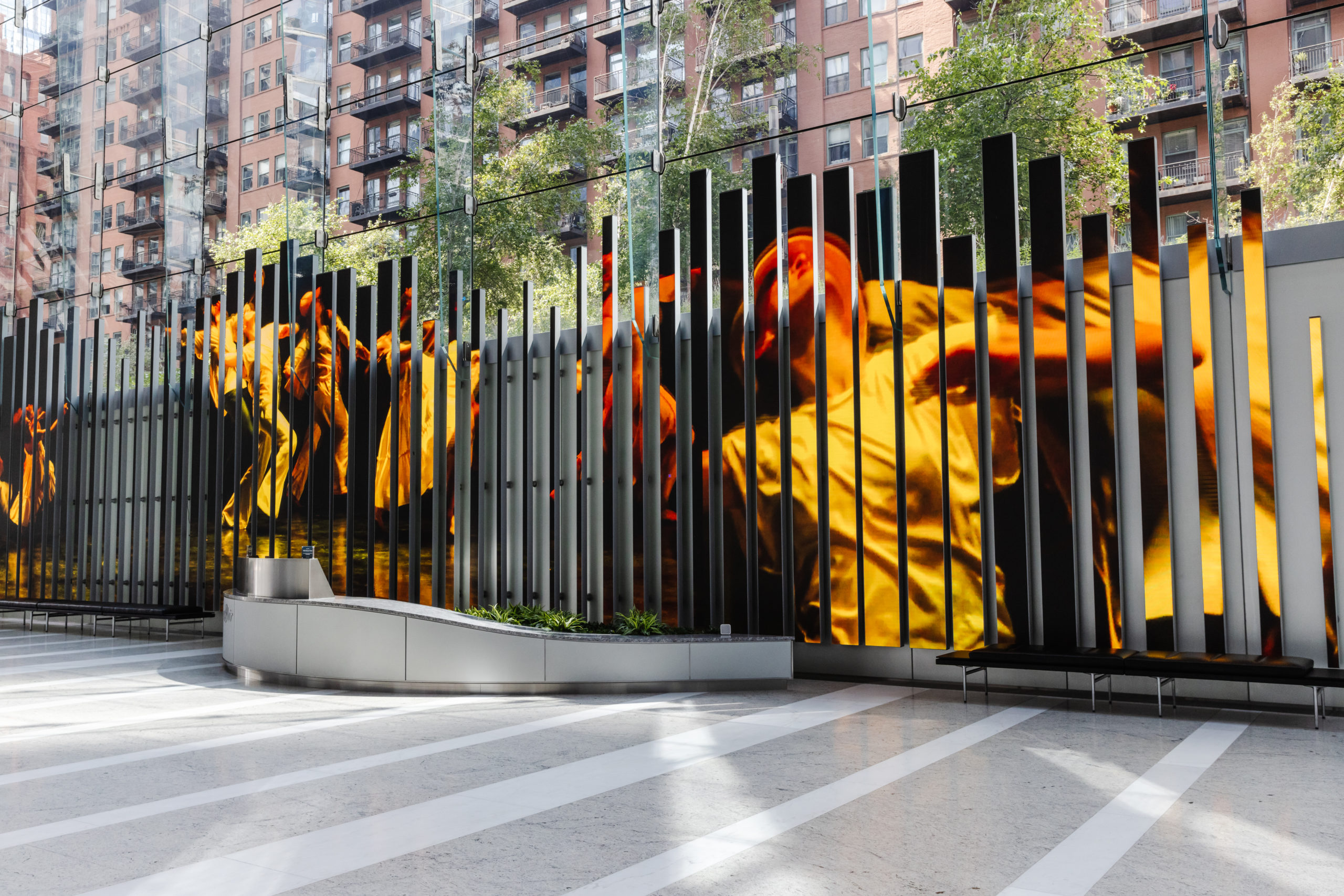 This exhibition and activation are a part of 150 Media Stream’s programming at 150 N Riverside Plaza. Curated by Yuge Zhou, this program presents multimedia art on a unique architectural screen located in the building’s lobby. Consisting of 89 LED blades that ignite into light, color, and movement across a wingspan of 150 feet, this dynamic screen has previously been populated by the work of fiber artist Bisa Butler, dancers from The Joffrey Ballet, and more.