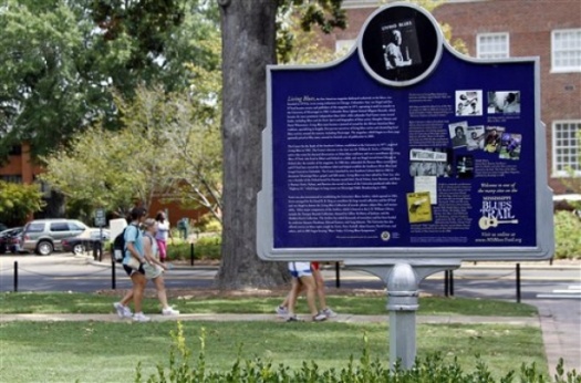 OXFORD, Miss. (AP) — Living Blues magazine is celebrating 40 years in the business. The magazine devoted to covering the African-American blues tradition has been owned by the University of Mississippi since 1983, but it got its start in Chicago, where Jim O’Neal and other blues lovers borrowed $300 to publish the first issue. Living Blues is the country’s oldest magazine dedicated to the genre and has an international distribution and circulation of more than 25,000. Among those gracing past covers were B.B. King, Bobby "Blue" Bland and Honeyboy Edwards. Current editor Brett Bonner attributes the magazine’s longevity to a formula from which it rarely strays: allowing the artists to describe how their culture drives the music. Copyright 2010 The Associated Press. Photo Caption: In this Sept. 1 photo, students walk past the Mississippi Blues Trail marker at the University of Mississippi campus commemorating the Living Blues magazine in Oxford, Miss. Living Blues is celebrating 40 years in the business. The magazine devoted to covering the African-American blues tradition has been owned by the University of Mississippi since 1983, but it got its start in Chicago, where Jim O’Neal and other blues lovers borrowed $300 to publish the first issue. (AP Photo/Rogelio V. Solis)