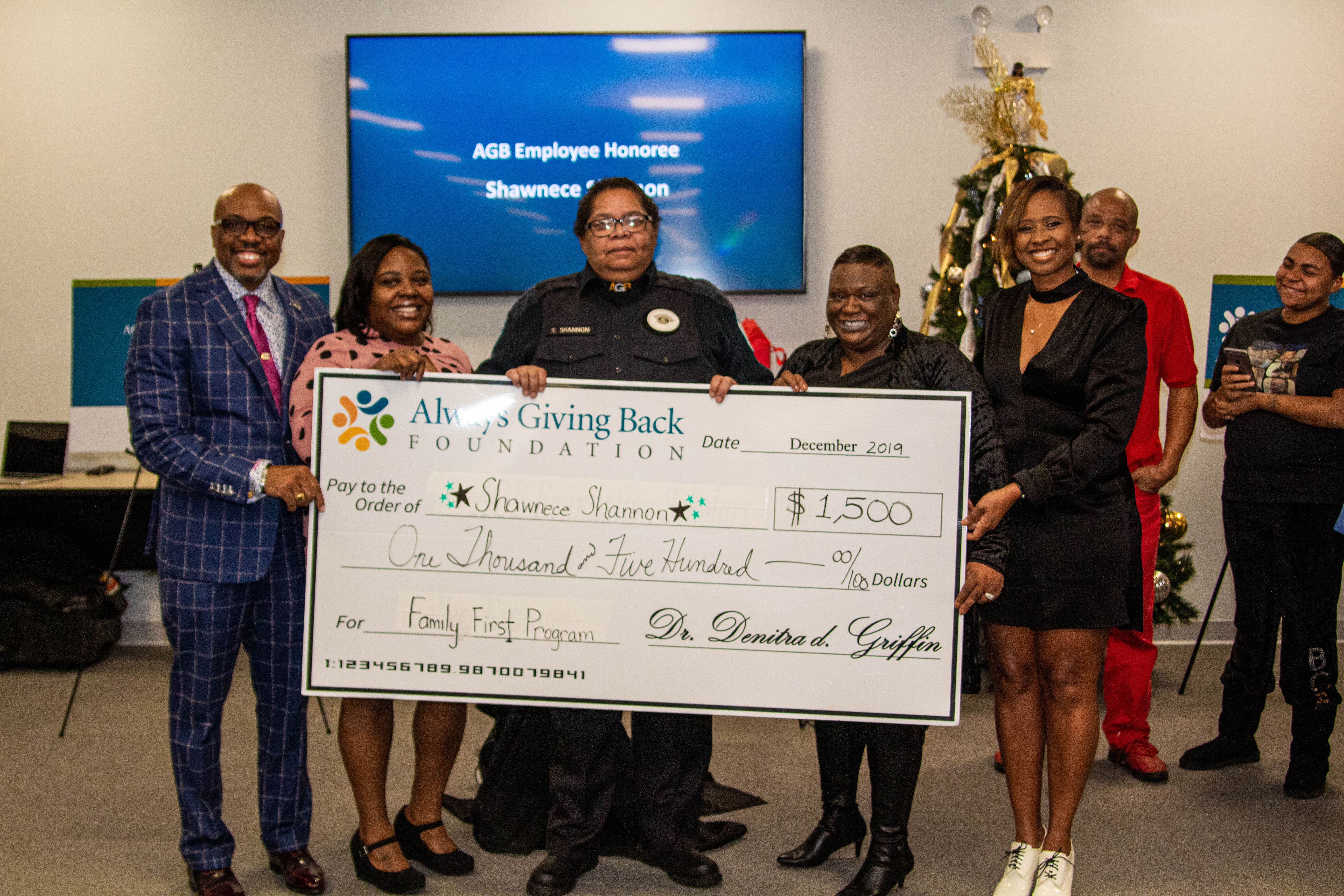 AGB Innovative Security Solutions, through its Always Giving Back Foundation, recently surprised five-year employee Shawnece Shannon with a check covering her December bills as a reward for her dedication and commitment to her job and family.