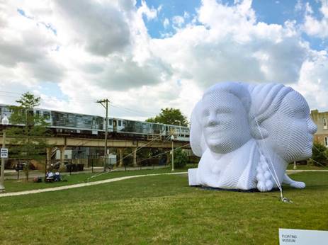 Green Line ‘South Branch’ features a gigantic roving, 25 x 35 x 34’ inflatable sculpture titled Founders, featuring four busts facing the four cardinal directions. Featuring a mix of interpretations of items from the DuSable Museum of African American History and the Field Museum collections, the busts represent du Sable; his wife, Kitihawa; Harold Washington (the first African American Mayor of Chicago); and a bust of a young boy by artist William Artis. Founders is popping up weekly thru September 11 in community spaces adjacent to the Green Line from Austin to Englewood and can be viewed both by CTA riders and those at ground level. For this installation, FloatingMuseum worked with the Field Museum and its Potawatami textile collection, in addition to collaborating with contemporary Native American artists Chris Pappan (Kanza, Osage, Cheyenne River Sioux) and Monica Rickert-Bolter (Potawatomi).