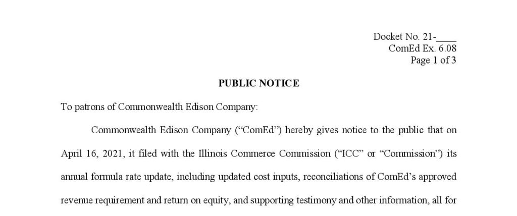 Commonwealth Edison Company (“ComEd”) hereby gives notice to the public that on April 16, 2021, it filed with the Illinois Commerce Commission (“ICC” or “Commission”) its annual formula rate update, including updated cost inputs, reconciliations of ComEd’s approved revenue requirement and return on equity, and supporting testimony and other information, all for the purpose of determining, pursuant to Section 16-108.5 of the Illinois Public Utilities Act (the “Act”), updated rates for delivery services applicable throughout ComEd’s service territory in northern Illinois to be applicable beginning with the first monthly billing period of 2022.