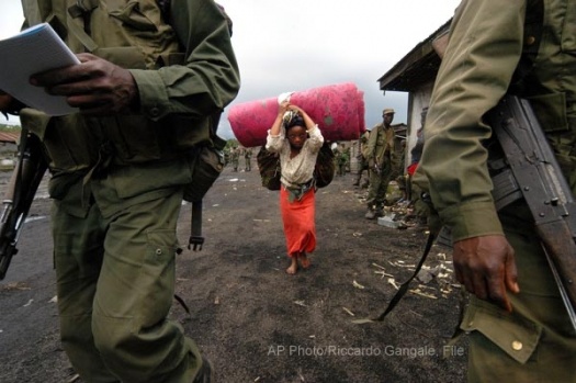 A woman carries a mattress and other belongings past Congolese army soldiers as she flees to escape fighting between U.N.-backed government forces and renegade troops loyal to a local warlord, in the village of Sake in eastern Congo in this file photo. Two years after the massive Central African nation held its first free elections in half a century, life is as dangerous as ever for many in the east despite the presence of one of the largest U.N. peacekeeping forces in the world.