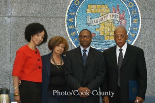 Tuesday the Cook County Board of Commissioners passed a resolution honoring the life of Thomas E. Wortham IV, 30, a Chicago police officer who was gunned down May 19 during a botched robbery outside his parents’ home in the Chatham community. He had completed two tours in Iraq and was 1st Lieutenant in the Wisconsin Army National Guard. Accepting the resolution were, from left: his sister, Sandra; mother, Carolyn; County board President Todd H. Stroger; and the officer’s father, retired Chicago police officer Thomas Wortham III. Photo/Cook County
