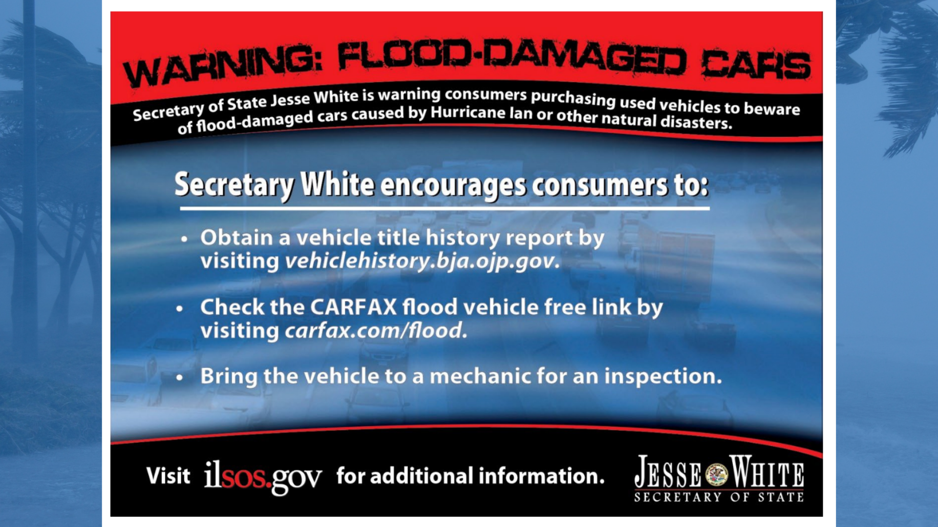 Illinois Secretary of State Jesse White is alerting consumers interested in purchasing used vehicles to beware of flood-damaged cars resulting from flooding caused by Hurricane Ian or other natural disasters.