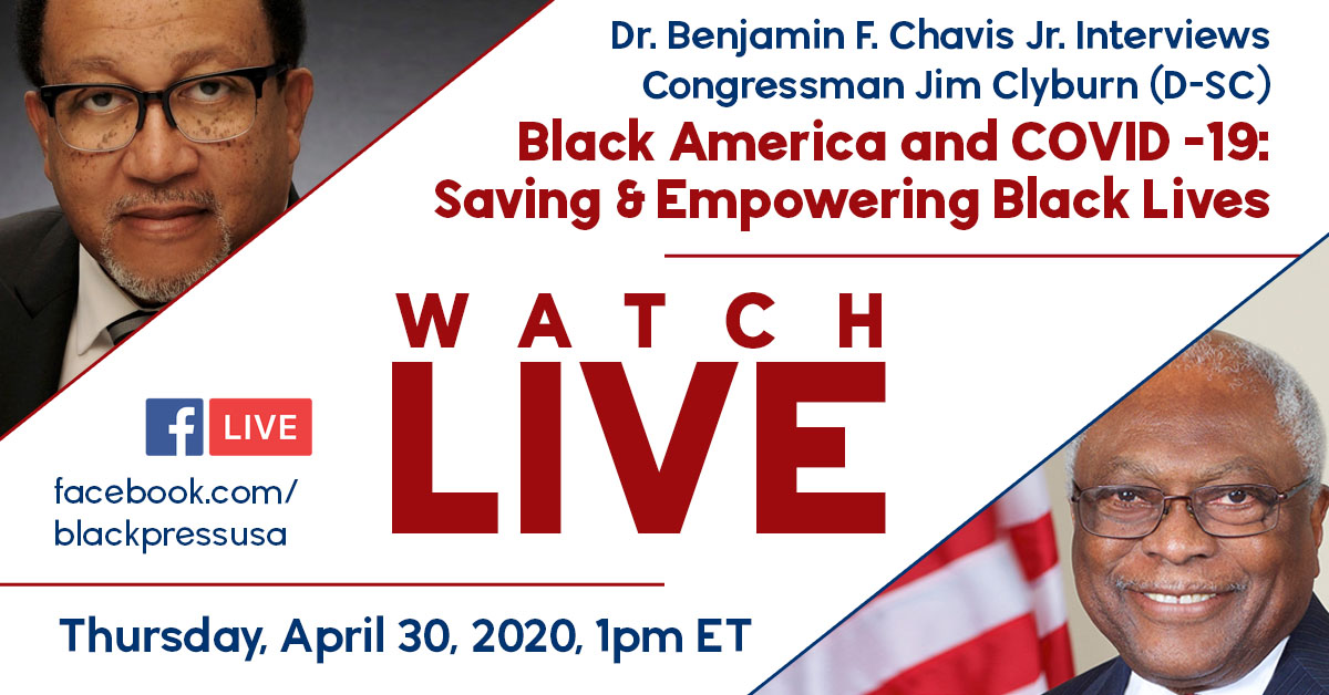 BREAKING NEWS: Washington, DC, April 28, 2020 — National Newspaper Publishers Association (NNPA) President and CEO Dr. Benjamin F. Chavis, Jr., will engage Democratic Party Majority Whip Congressman Jim Clyburn (D-SC) in an exclusive interview streamed live on Facebook at facebook.com/blackpressusa at 1 p.m., Eastern Time, Thursday, April 30, 2020.