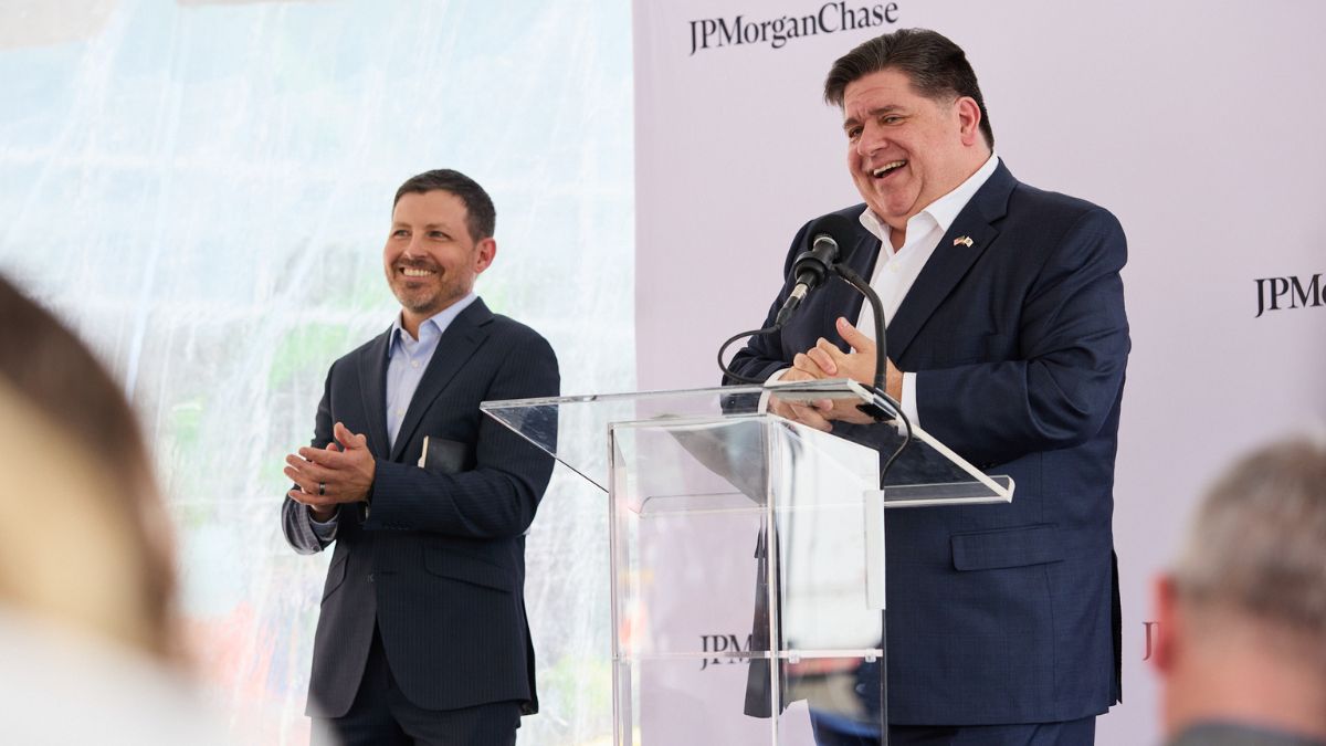 Illinois Governor J.B. Pritzker joins Kevin Goldsmith, managing director of community development tax credits and intermediaries lending at JPMorganChase (left), at a press conference on Sept. 10, 2024 announcing the firm has committed a new $10 million loan to the Chicago Community Loan Fund (CCLF), a certified Community Development Financial Institution (CDFI), to advance affordable housing development and revitalize neighborhoods in Chicago’s South and West sides. The loan is part of JPMorganChase’s $200 million commitment to Chicago and will support CCLF’s Communities of Color Loan Program, which provides low-cost capital to developers targeting projects impacting communities of color in low-to-moderate income neighborhoods throughout Chicago.