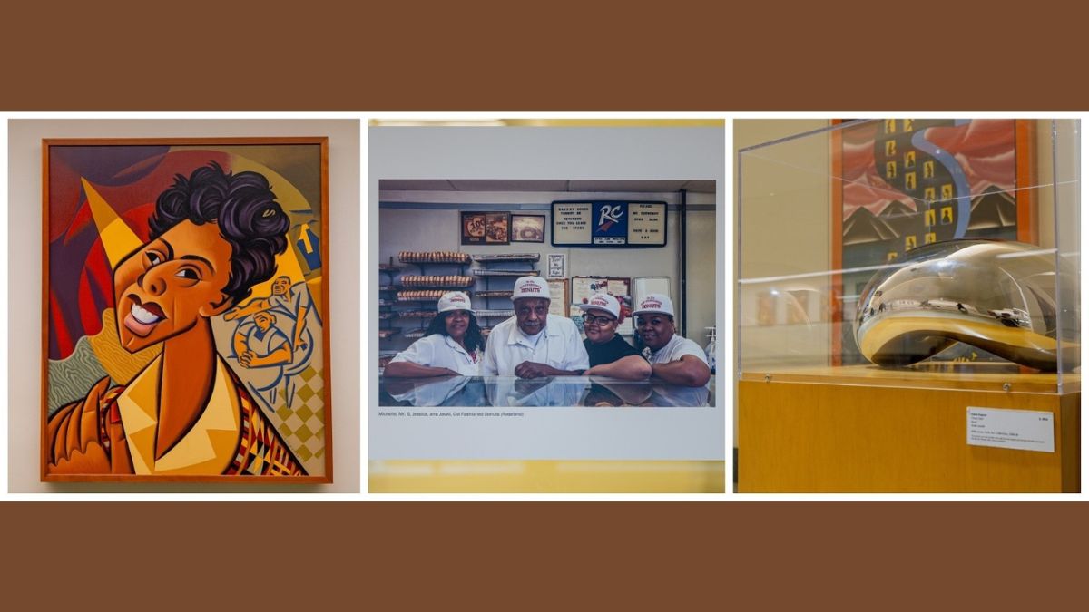 Pictured (L to R): Selections from Midway Public Art displays including Lorraine Hansberry, 30” x 36” oil on canvas by Steve Musgrave; Michelle, Mr. B. Jessican and Javell, Old Fashioned Donuts (Roseland) by Jonathan Michael Castillo; and Model for Cloud Gate, 2004 Stainless steel.
