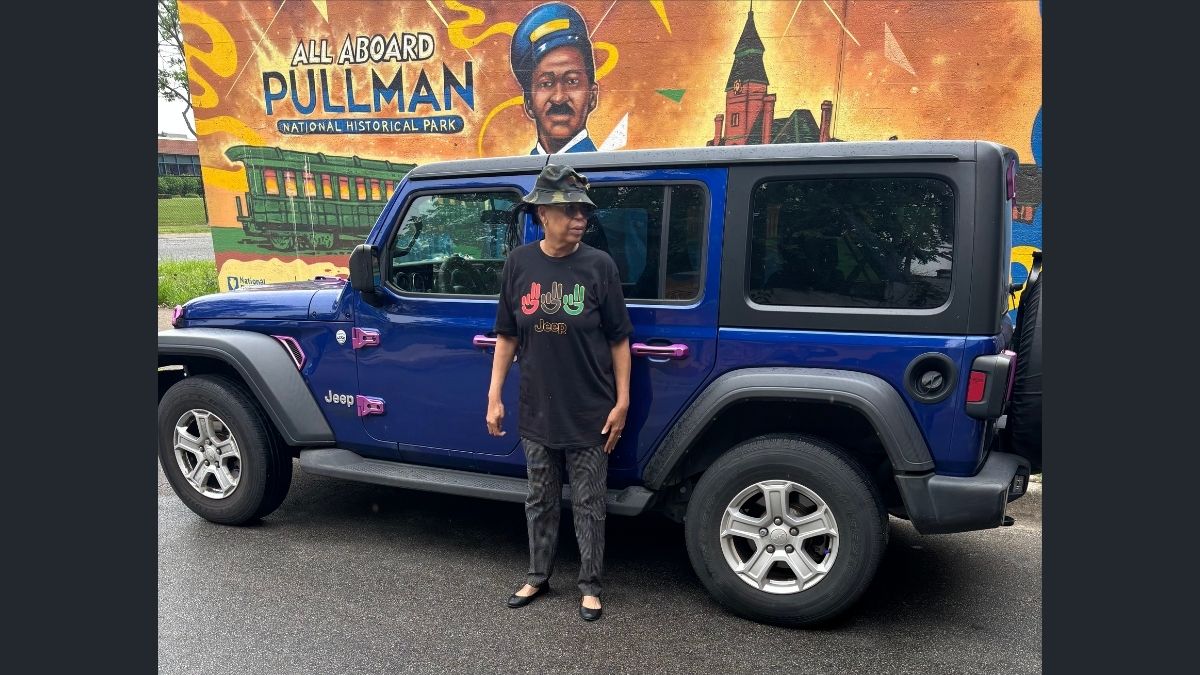 A Chicago Jeep owner in front of the Pullman Porter’s mural on the South Side (Photo courtesy of Melanated in Motion).