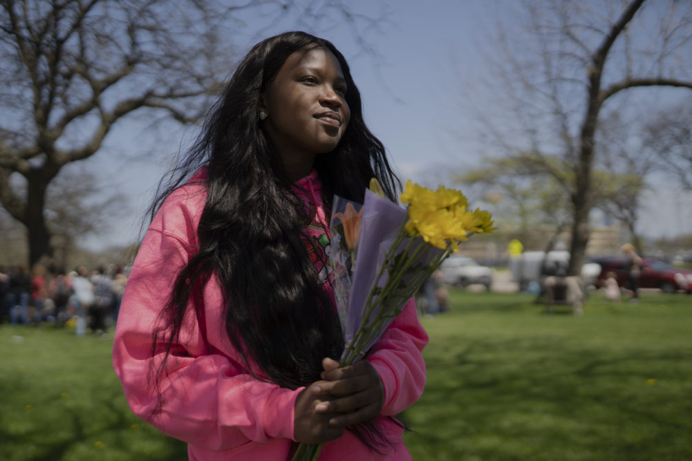 At the vigil, people arranged flowers while a child gave out packets of wildflower seeds that had the faces of incarcerated women on them. Other people stood at corners and near the entrance of the jail and distributed bouquets to women who were exiting the building. There were signs that read “Free our mothers” and bags of toiletries were laying on the grass.