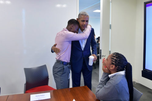 President Obama surprised a group of students who were at the Chicago offices of the Obama Foundation for a meeting of the Obama Youth Jobs Corps, a year-long workforce readiness training and internship program for high school sophomores, juniors, and seniors on Chicago’s South Side.