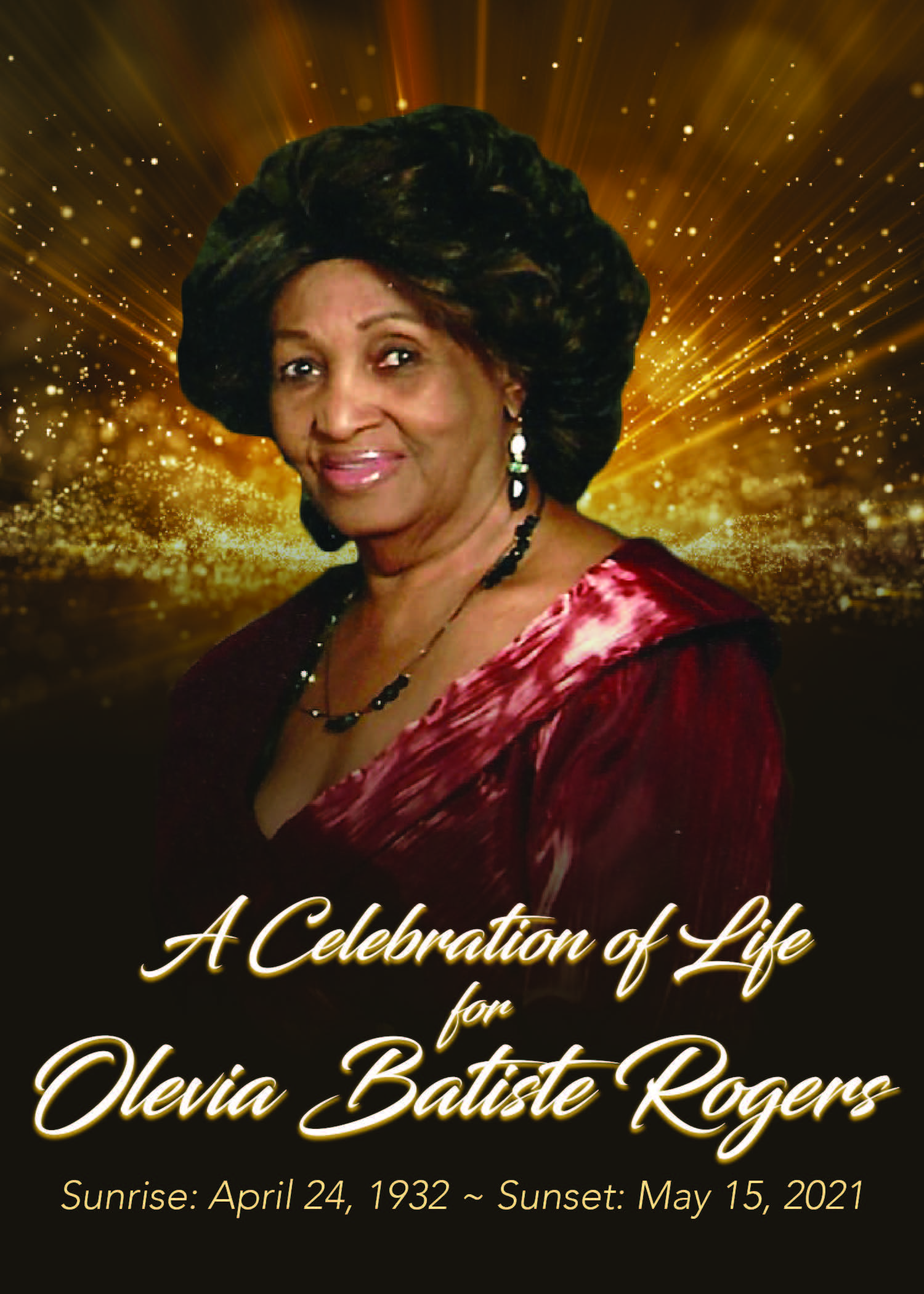 Olevia was a bright, shining soul and she departed this life quietly on May 15, 2021. She is preceded in death by: Walter E. Rogers, her husband of 54 years; her cherished granddaughter the late Angelique I. Watson; her parents, the late Walter Joseph Batiste and the late Victoria Josephine (Doyal) Batiste; and her beloved sisters; Amelia Batiste, Shirley Mae (Batiste) Fogan and Ethel Mae (Batiste) Holmes.