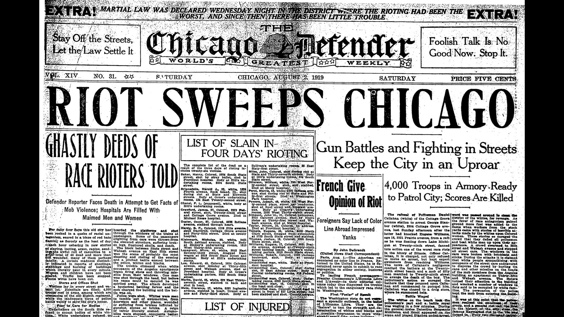 1919—The infamous Chicago Race Riot of 1919 begins. It would last for several days and require 6,000 National Guardsmen to put it down. The Chicago disturbance was the bloodiest of 25 race riots which took place in cities throughout the country. In fact, the summer of 1919 became known as the “Red Summer” because of the widespread number of racial conflicts. In Chicago, the rioting was started by White gangs harassing the large number of Blacks who had moved to the city for wartime jobs created by World War I. In addition to harassing and beating Blacks, the White gangs invented “drive-by shooting as they drove through Black neighborhoods firing rifles and pistols. Young Blacks formed mobs of their own and began retaliating. When it was all over 15 Whites and 23 Blacks were dead; more than 500 people had been injured and another 1,000 left homeless.