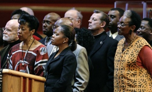 Rev. Otis Moss III, pastor of Trinity United Church of Christ, accompanied by Rev. H. John Thomas, General Minister and President of the United Church of Christ, left, and Rev. Dr. Michael Kinnamon, General Secretary of the National Council of Churches, speaks at a press conference at his Church Thursday, announcing that the UCC , joined by the NCCC in the USA are calling for a nationwide "sacred conversation" abut race in the United States.