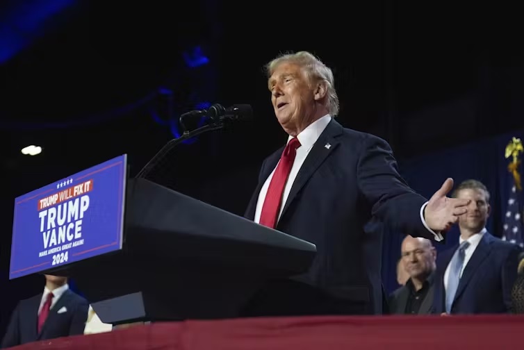 Donald Trump speaks to supporters early on the morning of Nov. 6, 2024. AP Photo/Evan Vucci